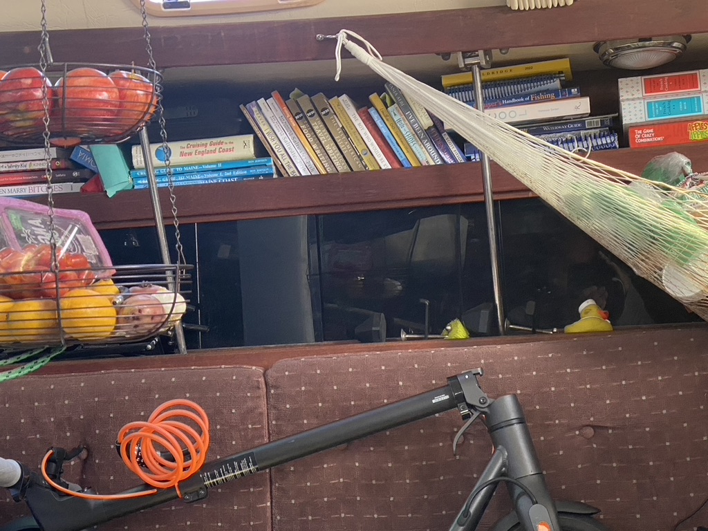 We did however leverage the marina’s dumpster and removed the plastic sliders from our main cabin which covered come cabinets into bookshelves. They’re a bit more open and it really helps us remember what is there, keep things from collecting moisture, and of course, the books fit better. I might just need to pick up some books from my parents’ house since I have a bunch stored in a few containers in their basement.
