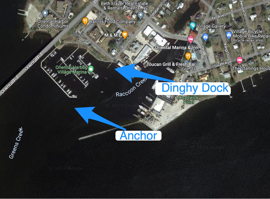 We try to anchor inside of the breakwater just off the Oriental Harbor Village Marina. I always feel like we are too close to the marina and too close to the channel but always seem to make it work. If it is too crowded inside there is plenty of room to anchor on the outside of the breakwater. With only 1hp on the dinghy, we prefer to be closer.