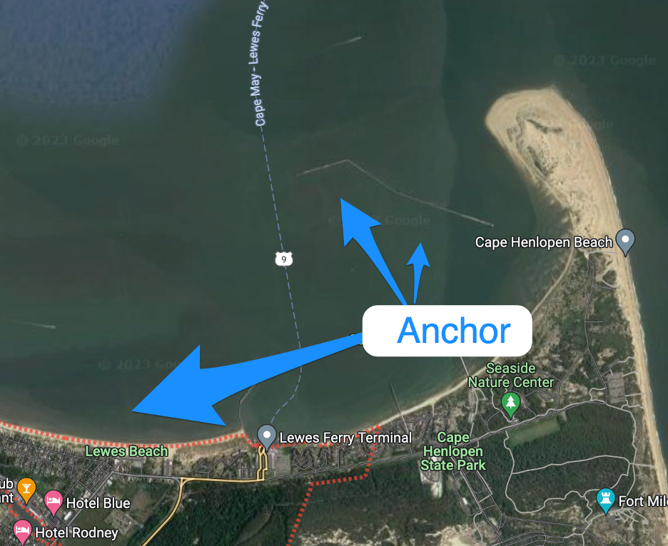Weather permitting we prefer to head all the way from VA to Sandy Hook NJ but if weather or exhaustion dictate we duck into Lewes DE on the southern side of the Delaware River entrance. There is ample room to anchor behind the breakwaters and if shore access is required or desired it is possible to anchor close to the beach west of the ferry landing site. Shore access is beaching on a very sandy beach. There is limited resources on shore other than restaurants.