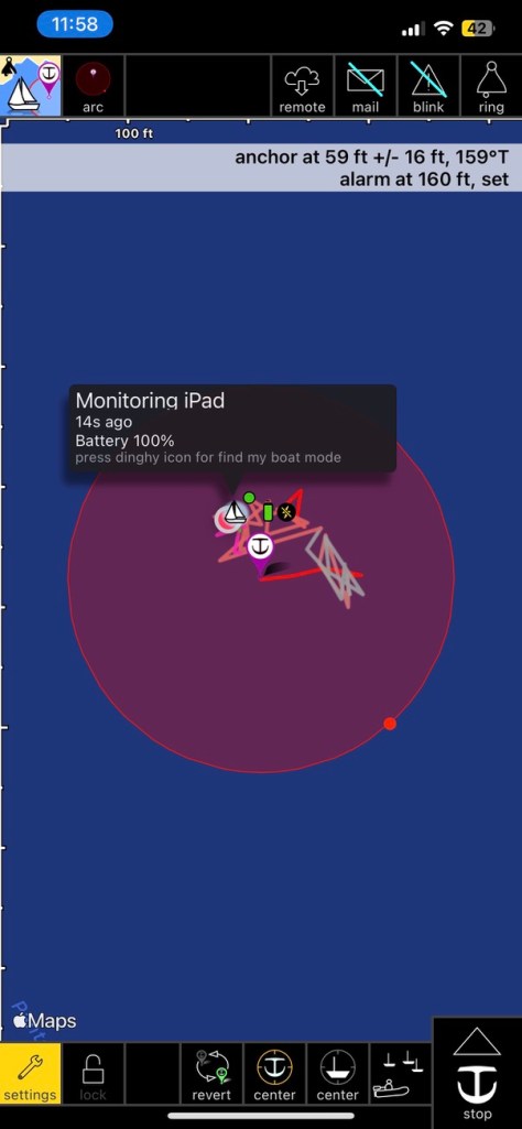 I’ve loved our anchor monitoring system for years, I had picked up an older refurbished iPad (5th generation) and had mounted it up in my bunk. We run some really amazing anchor monitoring software Anchor! And monitor it remotely over the internet.