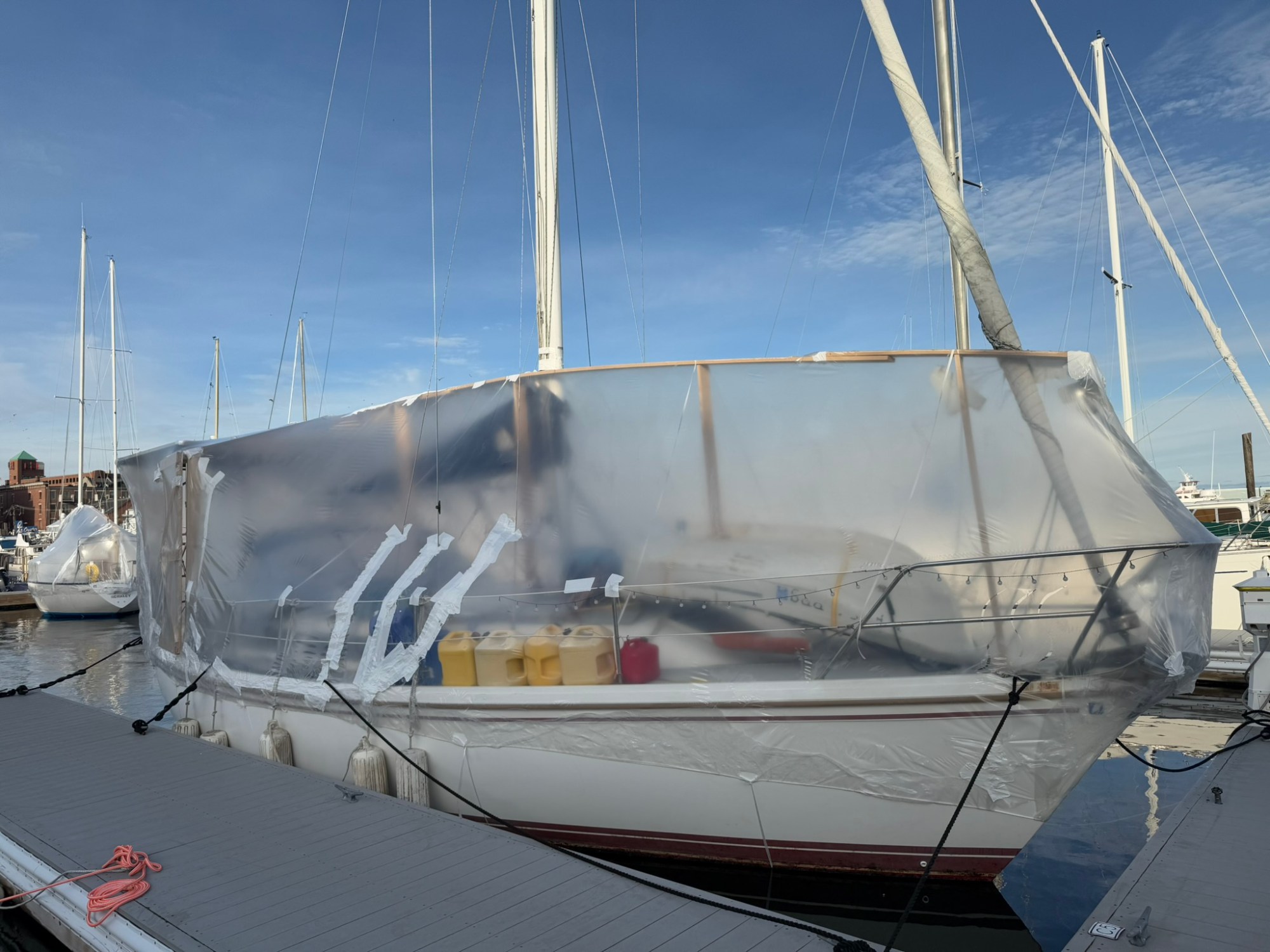 A clear plastic wrap that acts as a greenhouse to heat the boat as well as keeping snow from piling up. We were advised to get a “real door” and I’m glad we paid the extra for it. The wrap allows the deck and cockpit to get a full 10-20 degrees warmer than the outside air when the sun is up and really helps the heater keep us warm down below.