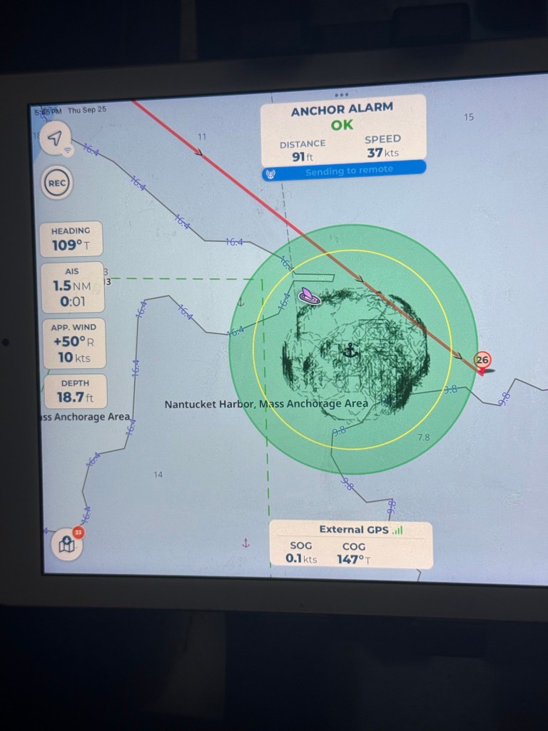 The spot we chose to anchor has some tidal current, so the boat can do some odd things when the tide and wind disagree. Even so though we had 25+ knots the other night and it was pretty flat and as you can see with the track on the anchor monitor there was zero issues with dragging.