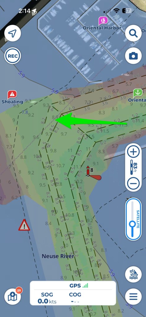 This means we’re often in Oriental for a week or more. We try to anchor “inside” the main harbor just off the Oriental Harbor Marina. The area has room for a few boats and while tight is a popular spot. We try to get in there since we’re usually waiting for the weather to avoid needing to go to the more crouded anchorage at Beaufort NC. There is surprising depth in the inner harbor.