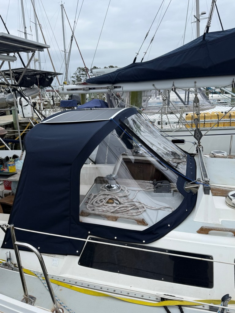 The total cost, and I’m sure she gave us a discount, was about $4,000 which seemed fair. As much as I want to learn how to sew and do some canvas and other boat sewing projects the dodger is too important for me to start with and we need something to keep us safe.